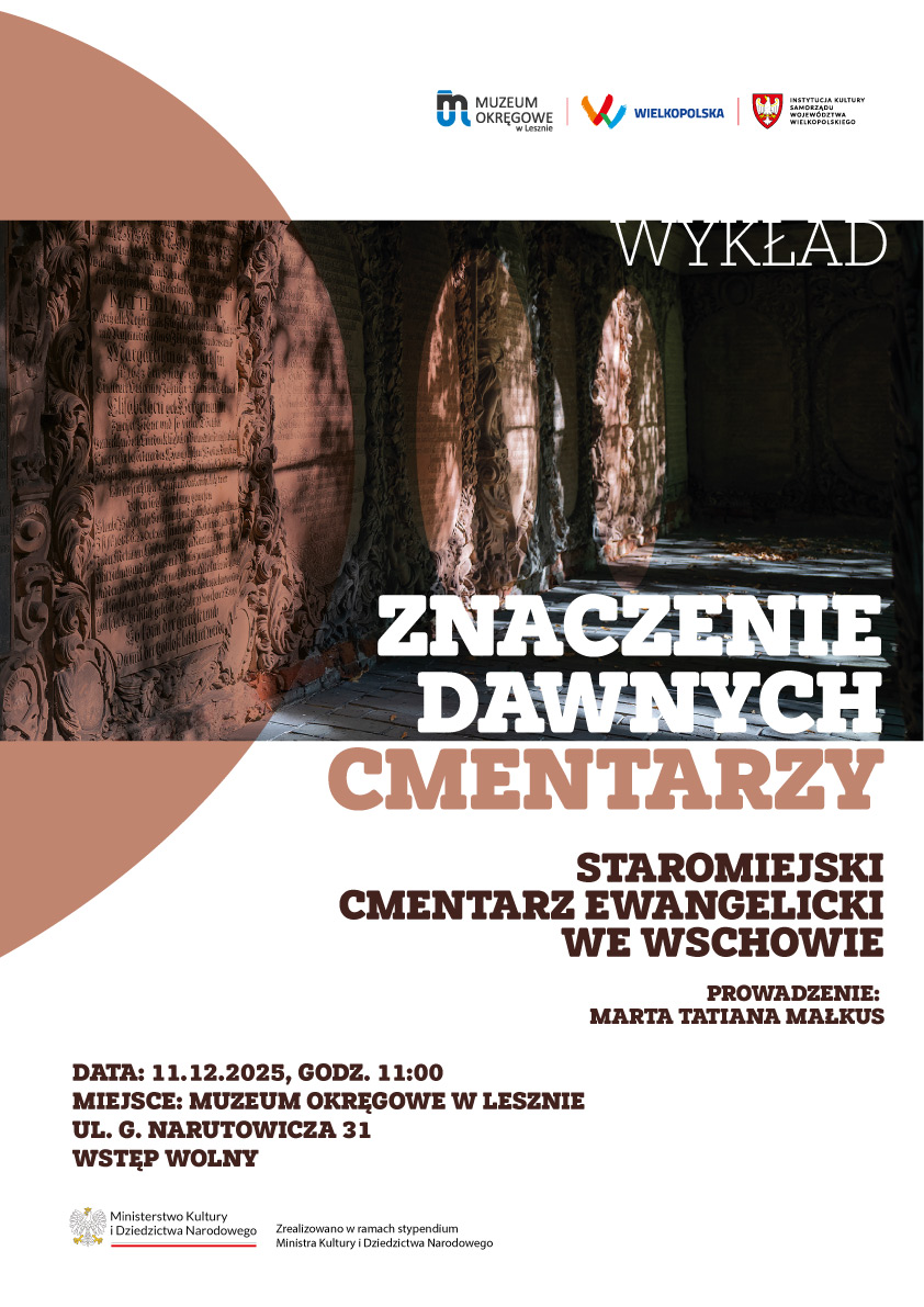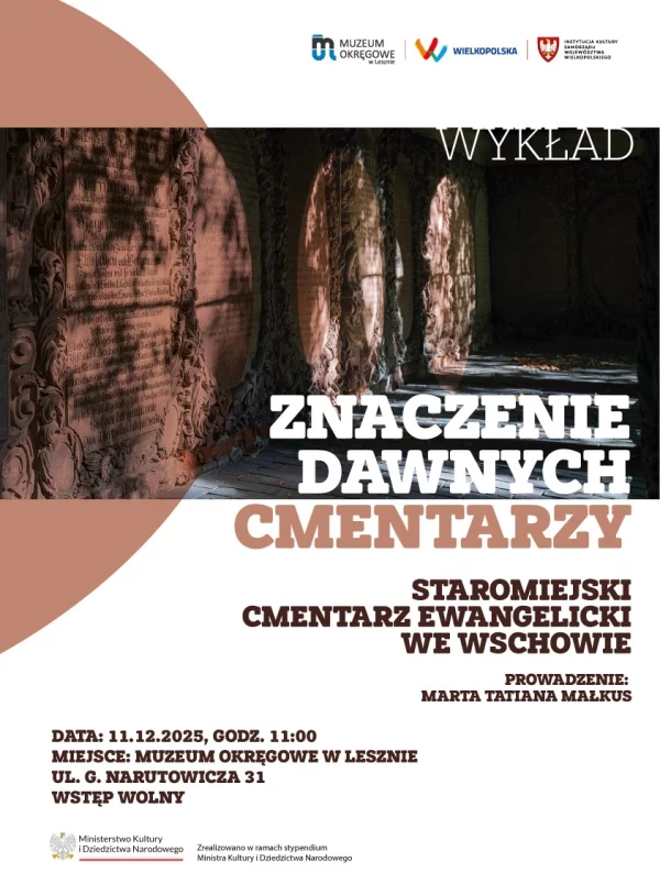 We invite you to the District Museum in Leszno, on December 11, at 11.00 a.m. Admission free. The meeting, which takes place as part of the project "Ut vivas disce mori – what do cemeteries teach us?", will be hosted by Marta Małkus, an art historian. The lecture is carried out as part of a scholarship of the Minister of Culture and National Heritage.