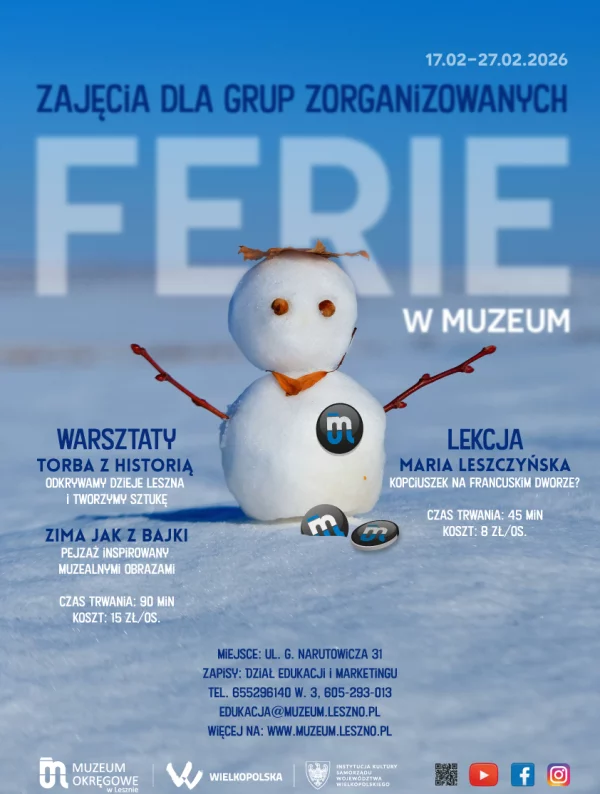 Ferie zimowe to doskonały moment, by połączyć atrakcyjną formę spędzania czasu z wartościową edukacją. Zapraszamy grupy zorganizowane do udziału w specjalnie przygotowanych zajęciach edukacyjnych „Ferie w Muzeum”, realizowanych w terminie 17–27 lutego 2026 r. w godzinach 9.00–15.00.